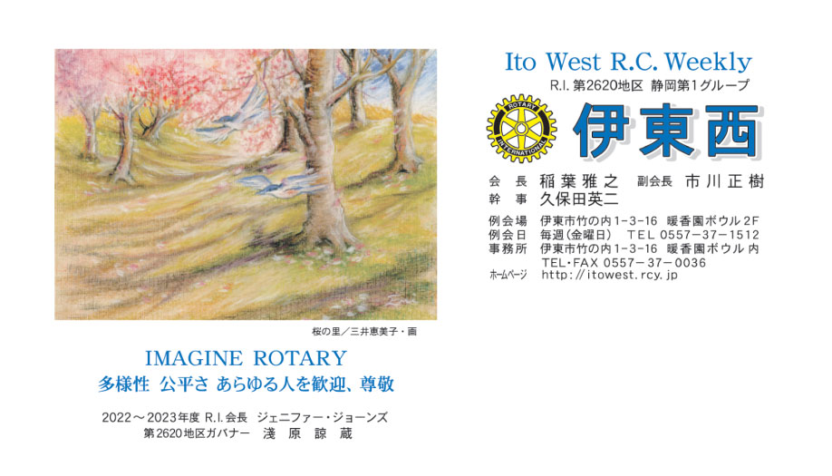 さて、2022-2023年度、私ども伊東ロータリークラブはジェニファージョーンズRI会長、そして浅原ガバナーの指導を実行、継続していきたいと考えております。